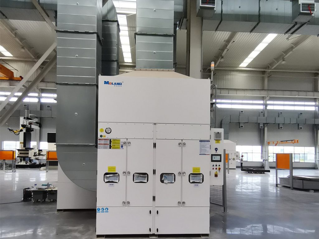 Besides the welding area, four grinding areas within the manufacturing workshop are also key targets for dust pollution control. These areas primarily handle dust generated from grinding, rust removal, polishing, and wire drawing processes. This type of dust consists of fine particles that diffuse rapidly and easily adhere to equipment surfaces and workers' clothing. It not only affects production precision but also poses a potential threat to employee health. Therefore, this project specifically equips suitable dust collection and treatment equipment, namely Moland's grinding dust collection cabinets. This dust collection equipment is equipped with not only high-efficiency filters but also a PLC intelligent control system, enabling real-time collection, filtration, and treatment of dust to ensure emissions meet standards.