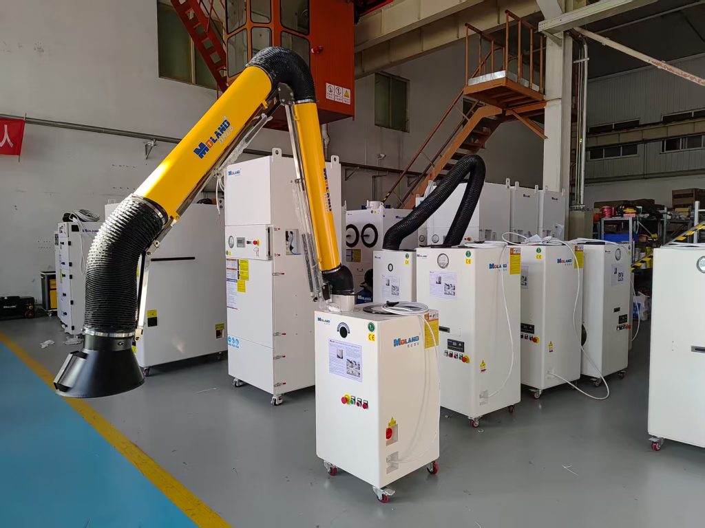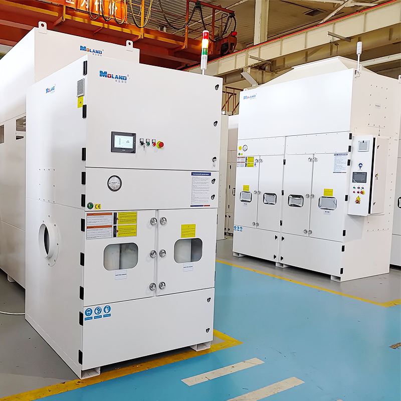2.Pengumpul Debu Industri Tetap (Sistem Pengumpulan Debu Terpusat): Seperti namanya, pengumpul debu ini dipasang di lokasi yang tetap. Alat ini biasanya lebih besar daripada ekstraktor bergerak atau portabel, dan desain ini digunakan untuk menangani asap, debu, dan partikel dalam jumlah besar. Pengumpul debu industri tetap biasanya terhubung ke perangkat pengumpulan titik akhir melalui pipa untuk pemurnian terpusat. Moland menawarkan sistem pengumpulan debu terpusat termasuk tipe lengan hisap, tipe tudung debu, tipe hisap tiup, dan tipe ruangan.