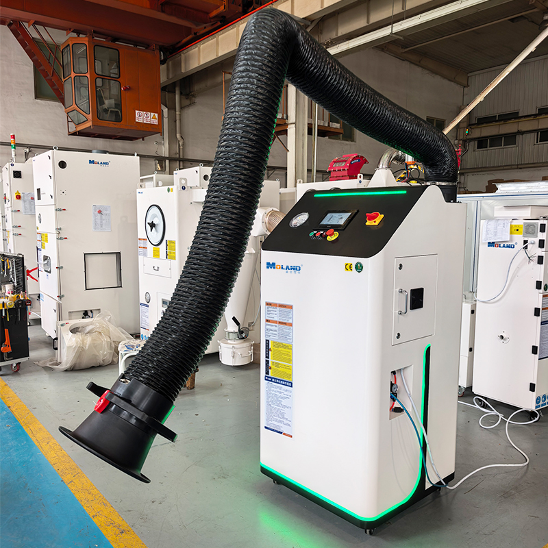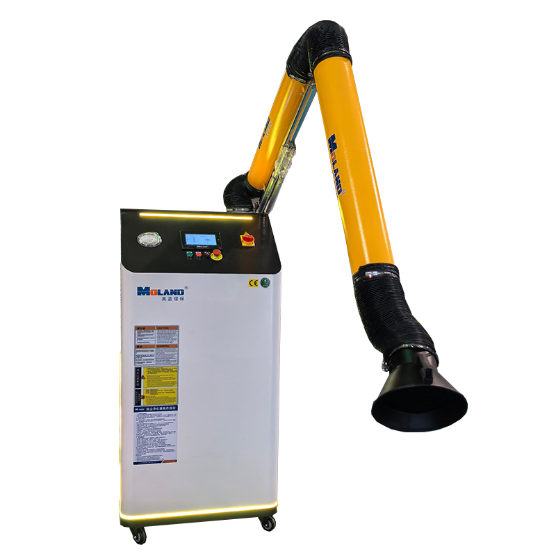 MLWF150-X Mobile Welding Fume Purifier — your reliable solution for efficient and safe welding fume management. Equipped with a nanofiber flame-retardant filter cartridge, it delivers an impressive filtration efficiency of 99.9% for particle dust of 0.3μm and above, ensuring superior air purification in welding workplaces. Stay informed with the visual ambient indicator lights that provide real-time status updates, letting you monitor the device’s operation at a glance. Built-in power supply detection and air pressure monitoring functions with instant fault alarm capabilities guarantee continuous and effective performance, minimizing operational disruptions. Reduce maintenance costs significantly thanks to the automatic pulse cleaning system, which efficiently removes dust buildup without manual intervention. The 360° rotating suction arm enables precise fume collection right at the source, capturing harmful particles before they disperse into the air, and protecting the health of operators while maintaining a clean working environment. Designed for versatility and reliability, the Moland MLWF150-X combines advanced technology with user-centric features, making it an essential tool for various welding applications.