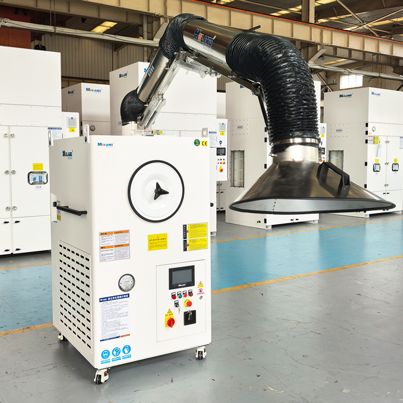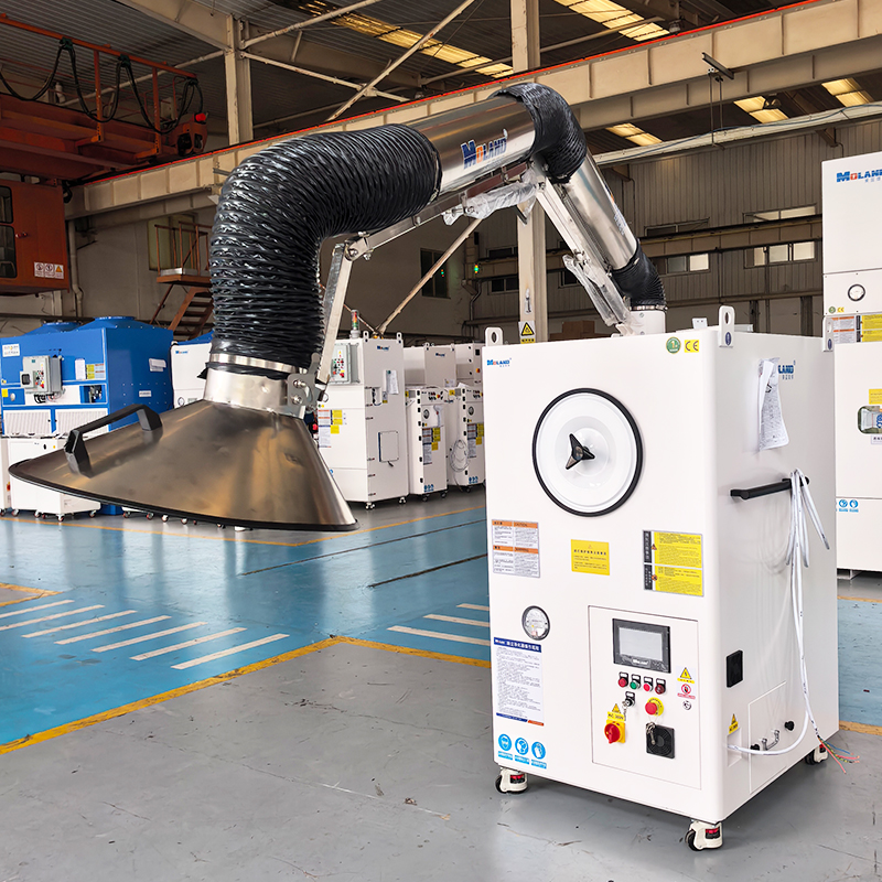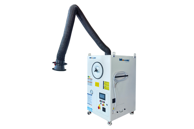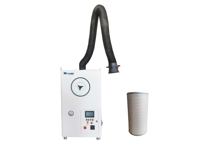 This mobile fume extractor is designed for industrial dust and fume in welding, polishing and other metal processing procedures. It is light weight and flexible, easy to operate. Using flame retardant Nano material cartridge filter, the filter efficiency up to 0.3um 99.9%. The extraction arm rotates 360 degrees and all adjustments are tooless.