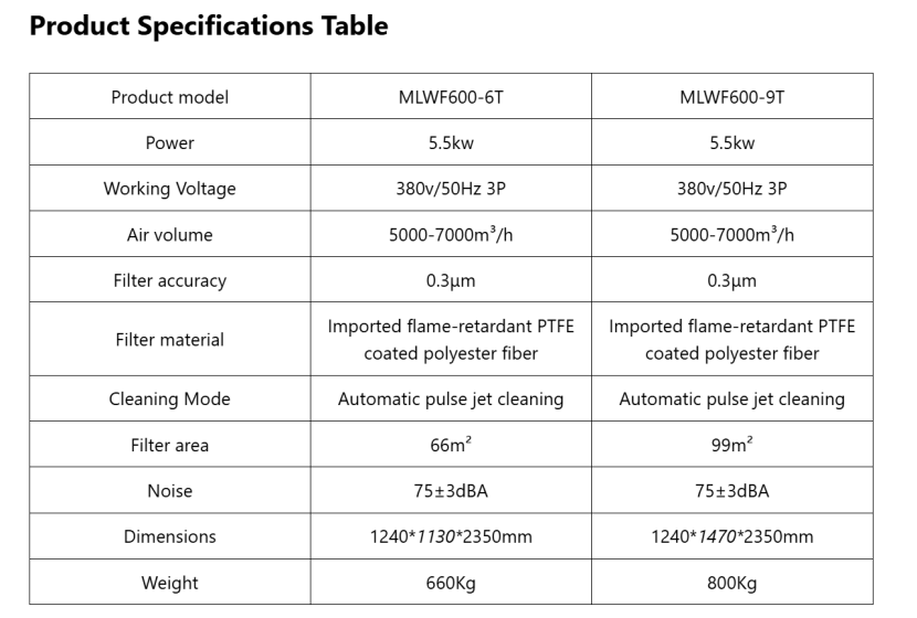 In summary, the MLWF600 - 6T/9T Stationary Dust Collector excels in power, filtration, and smart features. It’s a top pick for industrial dust control, making workplaces healthier and safer.