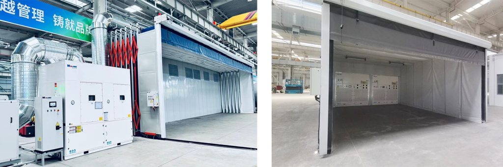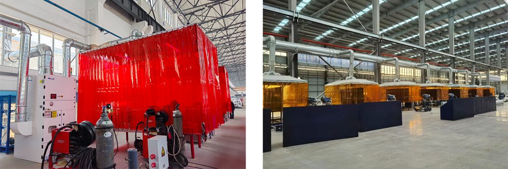 This method is suitable for welding large workpieces, especially when the workpiece requires crane handling and factory space is limited. The retractable booth can be retracted when not in use, freeing up space for other purposes.